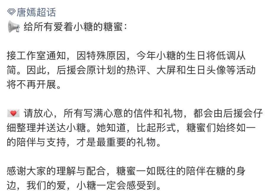 还有不到10天的时间就是唐嫣的生日了唐嫣还提到了是特殊原因所以生日低调从简所有的大屏包括头像什么的都不弄了简单吃个蛋糕就好这也是为了替公公守孝喜事暂且都不办了不炒作不需要粉丝应援做的太周到了。